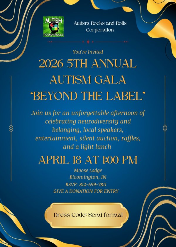 Autism Rocks and Rolls Corporation will be holding our 5th annual autism gala, Beyond the Label. The gala will happen on April 18, 2026, at the Moose Lodge in Bloomington, IN. WE ARE NEEDING GROUPS OF PEOPLE PASSING OUT FLIERS ON FOOT ON ALL 4 SIDES OF BLOOMINGTON. IF YOU WOULD LIKE TO TAKE A SHIFT DURING THE MONTH OF MARCH, PLEASE LET ME KNOW! 812-699-7811 or info@autismrocksandrolls.com
